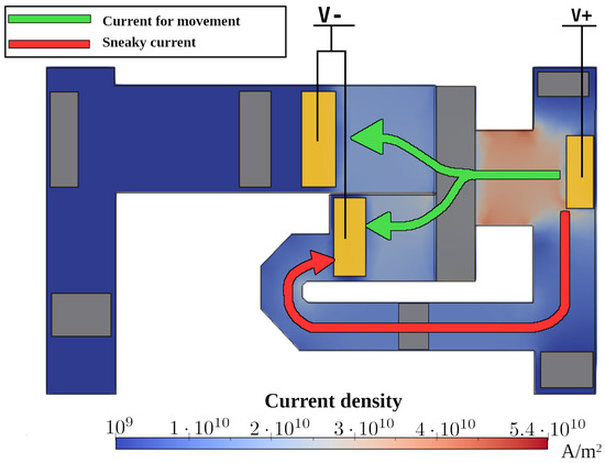 The memory cells were then simulated with Elmer FEM software [30] with the static current module. The simulations were performed in order to analyze the current distribution in the memory cell and evaluate the power consumption during circuit operation. The basic cell was simulated with the currents required for the correct information movement and elaboration. To generate the currents, a set of contacts was placed on the cell in the positions showed in Figure 3a. The power of every operation was derived. The value of resistivity used for the evaluation is reported in Table 1. An example of the simulation results is showed in Figure 9. The figure shows the movement of the information inside the processing zone.
