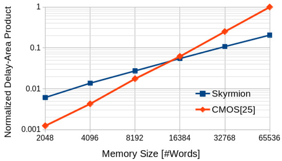Delay area product with respect to the memory size of the proposed skyrmion implementation and CMOS [27].