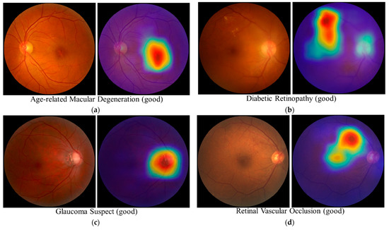 The first four image–GradCAM pairs (a–d) respond to well-presented examples. However, the fifth GradCAM (e) includes both true positive and false positive from the perspective of lesions, and the lesions are spread throughout the fundus image in the sixth GradCAM that can rather hinder the correct interpretation. Although the fifth and sixth GradCAM (f) falls into the “fail” category, we cannot conclude this, since our algorithm provides diagnosis from multiple abnormal findings from one fundus photograph. Whether or not GradCAM provides corresponding areas only for final diagnosis for heterogenous abnormal features needs much more investigation which is far beyond our current study range. Providing confidence or uncertainty can be an alternative approach that is actively used in research. All of these are still not so enough to address high interpretability; thus, it is appropriate to position these kinds of AI tools as decision support software for the moment.