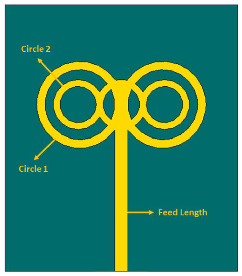 The proposed antenna design was printed on a 0.787 mm thick Rogers 5880 substrate with a relative permittivity of 2.2 and loss tangent of 0.0009. The front view of the single element is shown in Figure 1. The proposed design comprised five ring structures fused in such a way that a modified novel spiral shape was formed. The dimensions of proposed element were as follows: Circle 1 = 4 mm, Circle 2 = 1.5 mm and feed length = 10 mm with a feed width of 0.76 mm. The width of the circular slots was kept at 0.4 mm, and the distance between larger and smaller rings was also kept 0.4 mm. The length and width of the substrate was an LS of 14 mm and WS of 14 mm, while the length of the ground plane was kept at 7 mm only. The ground plane was incorporated with a half circle with an outer radius of 3 mm and inner radius of 2.6 mm, respectively.