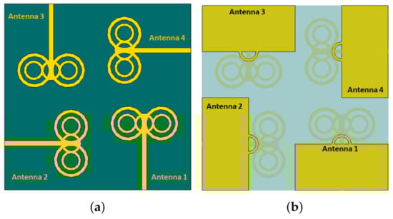 The proposed structure was transformed into a four-port MIMO array with an overall length and width of 30 mm × 30 mm as shown in Figure 2. The MIMO assembly was arranged in such a way that the radiating elements were at a 90 distance from each other.