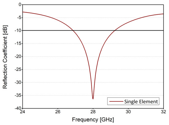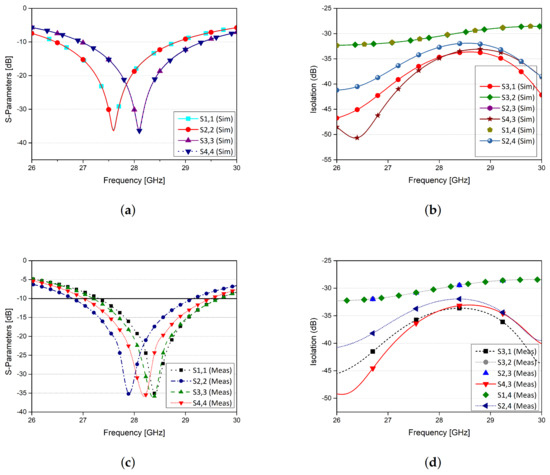 The S-parameter response is discussed in this section. The single-element reflection co-efficient response was tuned at 28 GHz with an impedance bandwidth of 2 GHz, as shown in Figure 4. In the MIMO configuration, the reflection co-efficient responses of Antenna 1 and Antenna 2 were slightly shifted but sufficiently covered the required bandwidth. Due to the perpendicular placement of radiating elements, the isolation of MIMO ports was found to be better than −29 dB. The simulated S-parameter response is shown in Figure 5a,b, while measured results are shown in Figure 5c,d. The measured coefficient results are slightly shifted, which can be attributed to human and measuring environment error. The measured isolation levels of the antenna were also found to be better than −29 dB levels, confirming the performance characteristics of the proposed structure.