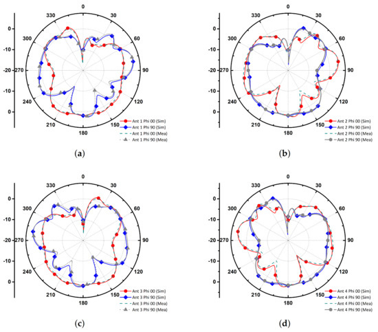 Simulated and measured radiation patterns: (a) AE-1 (b) AE-2 (c) AE-3 (d) AE-4. The polar coordinates show degrees, the y-axis is plotted in dBi.