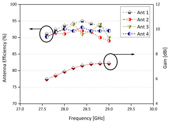 The simulated and measured radiation patterns were taken at a central frequency of 28 GHz on two principal planes, which were E and H planes, or at = 0 and = 90 as shown in Figure 6. The main lobe direction of antenna 1 in = 0 was between 90 and 150, while at = 90, the main lobe was between 60 and 90. Similarly, antenna 3 was the mirror image of antenna 1, and the radiation patterns of antenna 3 showed the main lobe between 210 and 270; at = 90, the main lobe was between 240 and 300. Regarding the radiation characteristics of antenna 2 and antenna 4, the main lobe was found to be in a reverse order to that of antenna 1 and antenna 3. This can be attributed to the perpendicular MIMO assembly of radiating elements, thus providing unique pattern diversity characteristics that are helpful for mitigating the multipath effect for communication systems. The variations in the simulated and measured radiation patterns can be attributed to the presence of attenuation and cable losses with probability of error in measuring the far-field setup. Although slight variation exists, the proposed MIMO structure gives a good impression of the simulated and measured radiation patterns. The antenna’s efficiency is given in Figure 7, which clearly shows that proposed structure is highly efficient throughout the band of interest. Figure 8 shows the 3D radiation patterns of the proposed MIMO antenna system. The 3D figures shows that the proposed antenna system provides pattern diversity from each port.