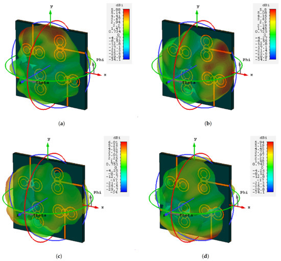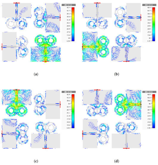 Figure 9 shows the distribution of the surface current for the proposed design operating at the 28 GHz band of interest for each antenna element, respectively. From the distribution of the surface current, it can be seen that the intensity of the current is high around the connected circle-shaped rings, showing that the contribution of these circular-shaped rings is more significant in the mm-wave band. Moreover, the level of the coupling among the elements is quite ignorable according to the distribution pattern of the current, which is achieved by the assembly of the elements with a shift of 90 per element.