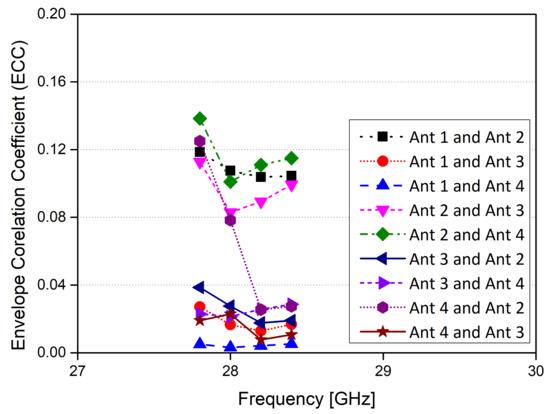 To check the level of the coupling among elements of the proposed MIMO antenna, the envelope correlation coefficient (ECC) is evaluated. The S-parameter method is utilized to evaluate the response of the ECC [29]. A low value of the ECC—i.e., below 0.16—is observed in Figure 10 across the desired band, showing that the level of interference is low among the elements.