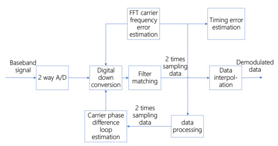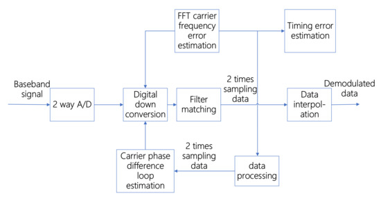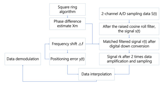 Figure 7 shows the new demodulation method proposed in this article. The new method also uses 2-channel A/D sampled data but, unlike the traditional method, it feeds the timing error back to the A/D data sample, which then passes through the digital down-conversion matched filter. After carrier recovery, the new method feeds the error back to the digital down-conversion, and then performs data interpolation and data demodulation through matched filtering. The specific implementation flow chart is shown in Figure 8 below.
