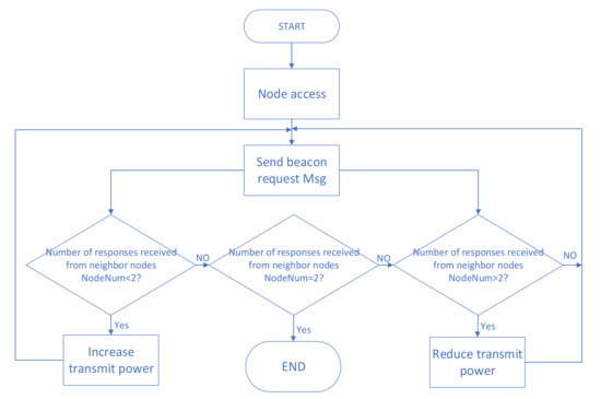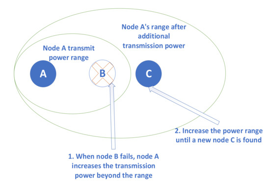 The transmission power required for wireless network signal transmission is proportional to the transmission distance [15]. When there are many nodes, a large amount of energy loss occurs in route discovery and route searching. To save the energy of the overall network, a power control mechanism is proposed. The power control mechanism (The schematic diagram is shown in Figure 4) is mainly aimed at remedial measures after the link is interrupted due to the breaking of a node during the networking stage. The transmitting power range of node A is the blue circle range. When node B, the neighbor of A, is damaged, node A’s transmitting power increases to cover the nearest node C in addition to node B.