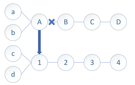 A link is placed near virtual nodes, and information in a particular area is routed through specific links. As shown in Figure 6, nodes a and b are routed through letter links, and nodes c and d are routed through digital links. During routing, when information is routed through node A to node B, the information of node A and B is packaged together. When vital link information is routed, the information of the passed node will be packaged together. Nodes c and d are treated similarly. When node B is damaged, node A and node B are broken, and node A temporarily forwards the information to node 1. The central controller can obtain node damage information via the information when parsing the file package for future maintenance.