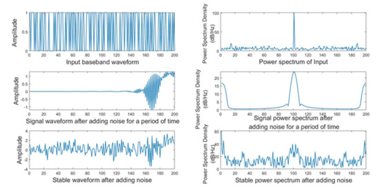 The number and type of equipment used is fixed. When the number is large, it may have an individual impact on the single experimental equipment. Therefore, a small amount of equipment was used temporarily for observation. To simulate the environment, a noise signal was superimposed on the input signal to simulate a mine environment. Then, MATLAB was used to detect the fluctuation of the data and intensity test, and observe the signal waveform. The input signal was stable, and the noise channel was superimposed to show a messy signal performance, as shown in Figure 17. After the channel conditions were stabilized, the waveform continued to show a messy signal performance, as shown in Figure 17. Thus, the other characteristics of the signal must be observed.