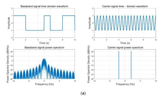 As shown in Figure 19a–c, the demodulated signal is consistent with the baseband signal, and the power is concentrated at 0 Hz, which is the same as that of the original baseband signal. It can be considered that the signal is undamaged and not affected by channel interference. Although this method involves some complication, it ensures that the demodulated signal’s properties remain unchanged. Furthermore, the performance is not compromised, which proves that the method is relatively successful.