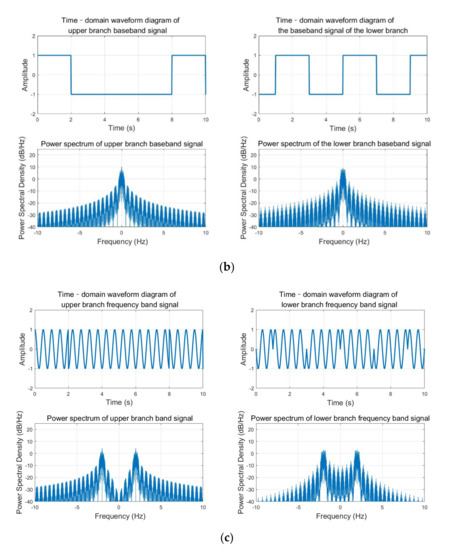 As shown in Figure 18a–c, the baseband signal sent by the information source is a stable signal with energy concentrated around 0 Hz. The signal and power performance of the upper and lower branches are similar to those of the baseband signal. The baseband signal is modulated and sent; whether the modulation changes the performance and or affects the subsequently received signal requires further observation.