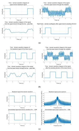 Signal performance diagram. (a) The time—domain performance diagram of the upper branch signal and the time domain performance diagram after the multiplier, low—pass filter and sampling decision; (b) The time—domain performance diagram of the lower branch signal and the time—domain performance diagram after the multiplier, low—pass filter and sampling decision; (c) Time domain waveform and power spectrum of baseband signal and demodulation signal.