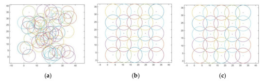 Schematic diagram of nodes tending to stabilize. (a) Initialization; (b) after time has elapsed; (c) stable state.