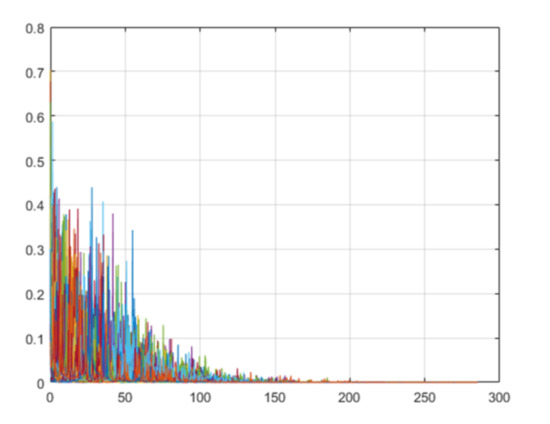 The simulation experiment under multiple devices requires the support of the conclusion of the O-QPSK simulation experiment based on feedforward timing, and the device initialization is first required. The device is chaotic during initialization but tends to stabilize over time, as shown in Figure 21.