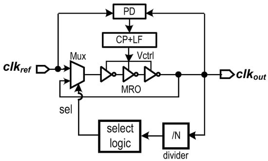 In this paper, instead of using a PLL, we introduce a clock multiplier technology that uses a digital multiplying delay-locked loop (MDLL) to obtain fast lock characteristics. A typical MDLL generates the output clock frequency fclkout that is N times the reference clock frequency fclkref, where N is the frequency multiplication factor [7,8,9,10,11,12,13,14,15,16,17,18,19]. Figure 1 shows the block diagram of a typical MDLL. It consists of a multiplexer (MUX), a multiplexed ring oscillator (MRO), a phase detector (PD), a charge pump (CP) + loop filter (LF), a divider N, and a select logic. By periodically injecting a clean reference clock edge, the MDLL can achieve better jitter performance with reduced loop bandwidth limit issues. The extended loop bandwidth of the MDLL can bring fast lock characteristics, but most of the MDLLs presented so far have been mainly concerned with jitter and phase noise characteristics.