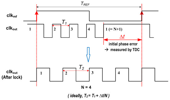 Figure 2 shows a conceptual diagram of the proposed MDLL detecting the initial phase error (=∆t) using a TDC at the beginning of the operation, where TREF is the period of the reference clock (clkref), T1 is the period of the initial output clock (clkout), and T2 is the period of the clkout after locking. Ideally, T2 = T1 + ∆t/N after locking, where N is the frequency multiplication factor.