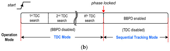 As shown in Figure 3b, in the TDC mode, the TDC search can be repeatedly performed several times. Each TDC search requiring three reference clock cycles uses a correlated double sampling technique [13,27] to eliminate mismatch and offset issues. Ideally, the TDC mode can be completed with only one TDC search. However, the mismatch problem between the MRO and TDC remains unless offset calibration is used, which leads to repetitive TDC searches. A single TDC search takes three TREF cycles, and the TDC mode is completed through a maximum of five TDC search iterations. Subsequently, when phase lock is completed, the LD generates the lock signal, and the MDLL enters the sequential tracking mode. In this sequential tracking mode, the TDC is turned off, and both the BBPD and the DSM are enabled. Therefore, after fast phase locking, the MDLL operates in a closed-loop and can track the process, voltage, and temperature (PVT) and environment variations while simultaneously reducing power consumption and improving jitter performance. The DSM receives 6-bit LSBs, LF [5:0], of the DLF and generates a 2-bit binary signal with a frequency 16 times higher than the BBPD operating frequency. Then, the DSM decoder generates dither [2:0] signals operating at high speed to control the DSM cells of the MRO, which effectively reduces the dithering jitter of the digital MDLL [15].