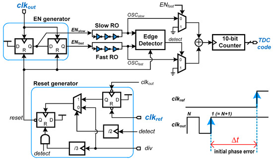 Figure 4 shows the block diagram of the proposed offset-free cyclic Vernier TDC. The proposed TDC consists of an EN generator, a reset generator, a slow ring oscillator (RO), a fast RO, an edge detector, two multiplexers, and a 10-bit up/down counter. The fast RO has a period of Tfast that is slightly faster than Tslow. As shown in the lower right Figure 4, the TDC is used to measure the initial phase error (=∆t) between the N + 1 th rising edge of clkout and the rising edge of clkref.