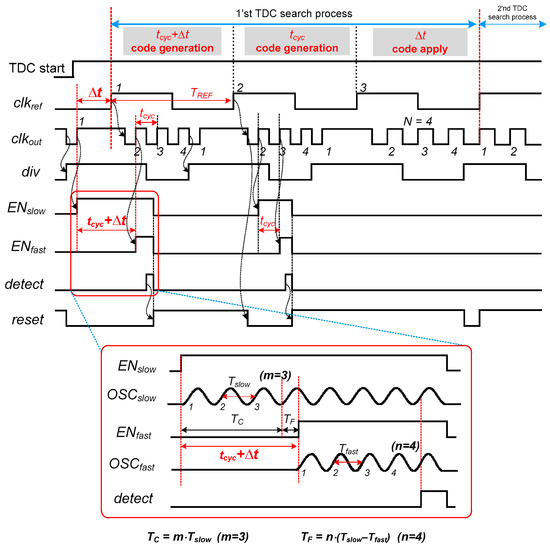 Figure 5 shows the detailed operation process of the proposed TDC mode with an example of N = 4. Each TDC search process takes three reference clock cycles. When the TDC is activated, the EN generator creates the ENslow and ENfast signals that enable the two ROs. The initial phase difference between these two signals is equal to tcyc + ∆t, where tcyc is the free-running period of the clkout (=output of the MRO). The 10-bit counter counts the oscillation number (=m) of the OSCslow signal during the time from the rising edge of the ENslow to the rising edge of the ENfast. Instead of using two separate counters, the 10-bit counter counts the oscillation number (=n) of the OSCfast again during the time from the rising edge of the ENfast to the rising edge of the detect signal: in this example, m = 3 and n = 4. The edge detector shown in Figure 4 compares the OSCslow and OSCfast signals and generates the detect signal when the rising edge of OSCfast leads to the rising edge of OSCslow. The detect signal makes the reset signal go to logic high, making the outputs of the EN generator fall to logic low. Then, the detect signal falls to logic low again. As a result, in the first reference clock cycle, tcyc + ∆t is measured and can be determined as follows: