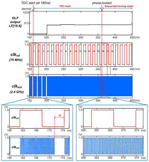Figure 7 shows the simulated locking process of the proposed all-digital offset-free cyclic Vernier-based MDLL. When the MDLL is enabled and the TDC starts operating at 160 ns, the initial phase error (=∆t) is about 2.9 ns. Since each TDC search process takes three reference clock cycles, the 10-bit output value of the DLF, LF [15:6], is changed at every three reference clock cycles. After five TDC search operations taking 15 reference clock cycles, the phase error becomes less than 2.3 ps, and the MDLL starts the sequential tracking mode. At this point, the MDLL is phase-locked, the TDC is turned off, and the BBPD and DSM are turned on to maintain the lock state.