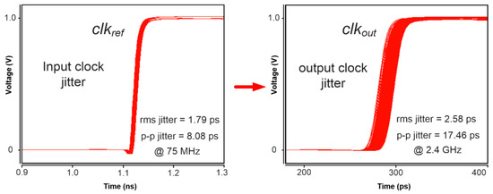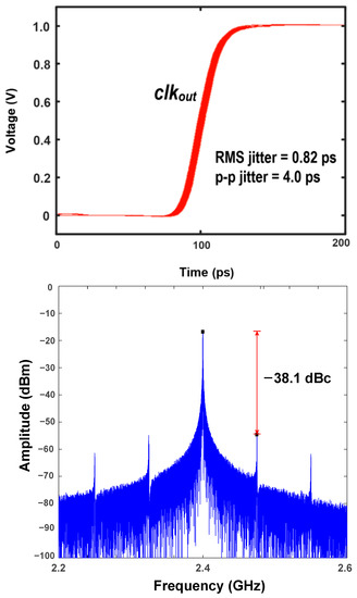 Figure 8 shows the simulated jitter and reference spur performances of the proposed fast-lock all-digital MDLL at 2.4 GHz (N = 32). It achieves a root-mean-square (RMS) jitter of 0.82 ps and a peak-to-peak (p-p) jitter of only 4.0 ps. It also achieves a reference spur of −38.1 dBc. As shown in Figure 9, with an intentionally injected 8.08 ps p–p input clock jitter noise, the proposed MDLL obtains a 17.46 ps p–p (RMS jitter = 2.58 ps) output clock jitter. This means that even when input noise is injected, the effective p–p jitter is only 9.38 ps (=17.46 ps − 8.08 ps). Table 1 compares the performance of the proposed MDLL with previous digital MDLLs. Among the digital MDLLs, the proposed MDLL has the fastest locking time of less than 15 reference clock cycles, which is suitable for use in energy proportional serial link applications.