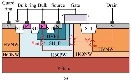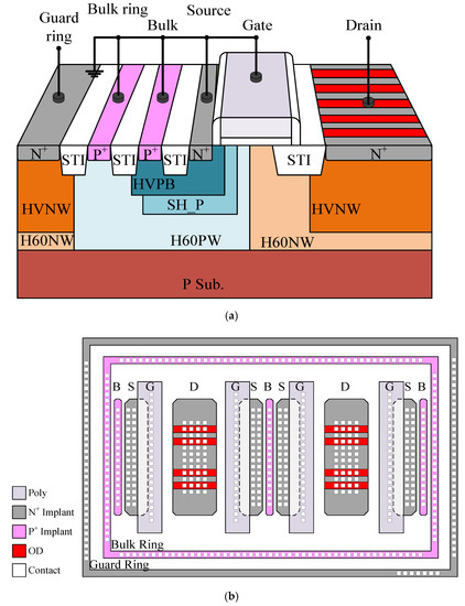 High-voltage (HV) laterally diffused metal-oxide–semiconductor transistors (LDMOS) are often used as ESD protection components at the input/output electrodes of circuits to prevent the circuit latch-up effect, which causes the element to burn out. We designed LDMOSs with a protective ring. Typically, to withstand high voltage, a long drift region is necessary and various concentration regions of N-type and P-type doping are used to form a concentration gradient. Furthermore, the element has a high drift region resistance. Various concentration gradients are used to disperse strong electric fields and extend the length of the depletion region to increase the breakdown voltage. Figure 1a displays the cross-sectional view of the parasitic equivalent circuit of the LDMOS component, Figure 1b displays the 3-D structure view, and Figure 1c displays the layout view of the HV nLDMOS reference element. The test element used in this experiment was a nonbutted structure that was fabricated using the TSMC 0.25-μm HV 60-V bipolar-CMOS-DMOS (BCD) process. The component was developed to improve the ESD discharge current capability. The multifinger symmetrical layout design was used in these HV LDMOS transistors to reduce the layout area of elements. The total finger number is four. The channel width (Wf) of each finger of the element was 75 µm. Therefore, the total channel width (Wtot) was 300 μm. A gate-grounded nMOSFET configuration was used in the HV ESD protection structure. The instantaneous ESD surge current was discharged through the parasitic BJT path below the nLDMOS below nLDMOS.