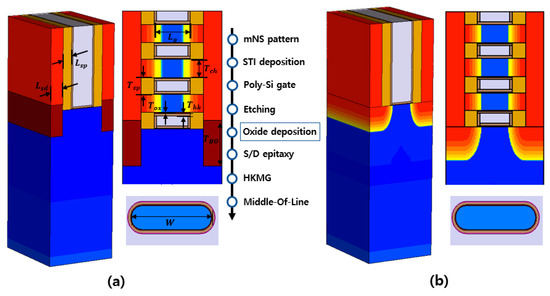 To proceed with the technology–computer-aided design simulation to perform the analysis at the device level for the mNS-FET device, refer to the prediction roadmap for the 3/2.1/1.5 nm technology nodes of the International Roadmap for Devices and Systems (IRDS) institute, as listed in Table 1. As shown in Figure 1, an mNS-FET structure has nitride in the spacer area, and the channel is surrounded by SiO2 and HfO2. Figure 1a shows a structure where an insulator is added to prevent the leakage current component of the lower channel, and in Figure 1b, the existing mNS-FET structure is illustrated. In Table 1, the structural information of all mNS-FET devices is specifically listed.