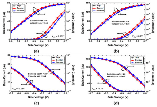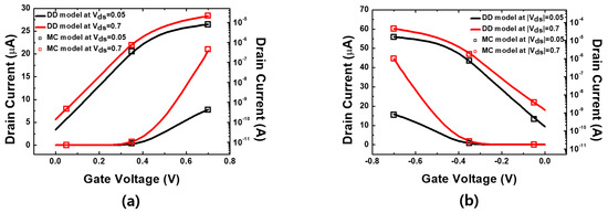 Before proceeding with the simulation of the entire structure, for an accurate analysis of the channel part, as shown in Figure 2, a structure considering one part of the channel of the mNS-FET was created separately, and a Monte Carlo simulation [16,17] was performed to calibrate the drift–diffusion simulation. Then, the values of the trajectory transport coefficient and velocity saturation parameter were extracted. The reason for using this simulation is that complementary metal–oxide-semiconductor technology has evolved to a technology node of 10 nm or less, ballistic transport alone cannot quantitatively explain the loss of mobility in a small channel length, and the Boltzmann transport equation must be solved. Figure 3 shows the Monte Carlo simulation results and the calibration results of the drift–diffusion simulation through the above process. Figure 3a shows the results for the N-type structure and Figure 3b shows the results for the P-type structure.