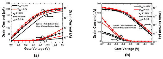 Current–voltage characteristic graph according to the presence or absence of bottom oxide: (a) N-type; (b) P-type.