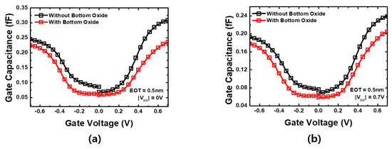 Gate capacitance characteristic graph according to the presence or absence of bottom oxide: (a) ; (b)