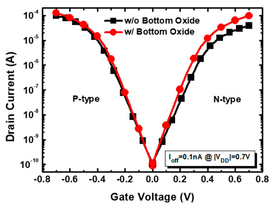 Before proceeding with the analysis at the circuit level, Figure 7 shows that the off-current for each N- and P-type was set as 0.1 nA, according to the presence or absence of bottom oxide.