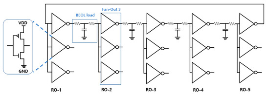 Benchmark circuit with five-stage ring oscillator, a fan-out of three, and backend-of-line (BEOL) load.