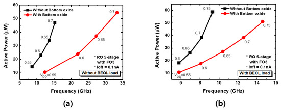 Based on the circuit diagram in Figure 8, we confirmed the performance improvement in terms of power consumption and speed of the circuit. Figure 9 shows the performance graph according to the presence or absence of the BEOL load. Figure 9a shows the performance graph when there is no BEOL load according to the supply charge, and Figure 9b illustrates the performance graph when there is a BEOL load. From the graph, it can be observed that the graph is located on the right at all supply voltages when the result of the structure with bottom oxide is compared with the result of the structure without bottom oxide, regardless of the presence of the BEOL load. This result indicates that when bottom oxide is present, the speed is improved for the same power consumption and the power consumption is reduced at the same speed.