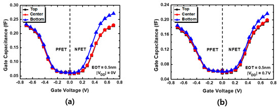 From Table 2, it can be confirmed that the SS and DIBL characteristics were improved, regardless of the N- or P-type in the structure, with the bottom oxide structure. Figure 5 shows the comparison of the measured current–voltage characteristics of the multi-nanosheet FET, fabricated in the previous paper [4], to the TCAD simulation used in this paper. Although it is difficult to make a perfect comparison because all device dimension values are not clearly presented in [4], it is confirmed that there is no significant difference from our TCAD simulation results. Note that the comparison was made only for N-Metal Oxide Semiconductor (NMOS). This is because N/P-Metal Oxide Semiconductor (N/PMOS) is expected to have symmetric current–voltage characteristics because off-current target and on-current balancing are performed with the same N/PMOS current characteristics. Therefore, in the current–voltage characteristic graph, it can be observed that when the bottom oxide is present, the leakage current component of the lower channel is controlled, and performance is improved correspondingly. Gate capacitors can be largely divided into parasitic capacitor components and intrinsic capacitor components. As technology nodes become smaller, the influence of parasitic capacitor components increases and is a major cause of deterioration in performance owing to the increase in the delay time in devices and circuits. As shown in Figure 6, it can be observed that the structure with bottom oxide has a smaller gate capacitor value. Unlike the existing structure, it can be observed that the bottom oxide occupies the source/drain portion, and thus, the parasitic capacitors in the gate-source and gate-drain portions are reduced.