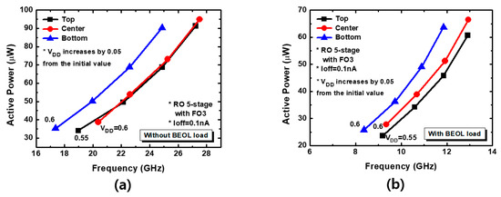 Power–frequency graph according to BEOL load: (a) without BEOL load and (b) with BEOL load.