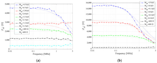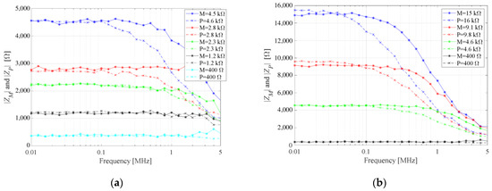 For this analysis, we used R1 = 98.4 kΩ and R2 = 98.4 kΩ, whereas the specified frequency range is from 10 kHz to 5 MHz. The memristor impedance has been obtained by using experimental results and Equations (14) and (16) The impedance of the potentiometer was obtained using the same methodology. Figure 7 illustrates the comparison between the impedance magnitudes of the memristor and potentiometer. To get a better insight into the comparison between memristor and potentiometer, we have divided the results according to initial impedance magnitudes at 10 kHz.