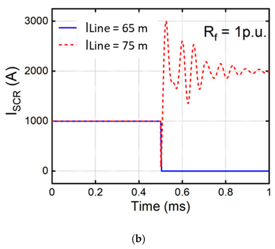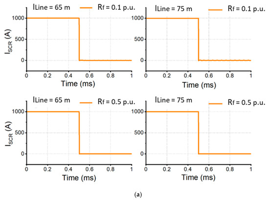 According to the circuit connection shown in Figure 1, a simulation testing system was built in the Matlab/Simulink environment. The ZCB’s parameters were configured in the testing system as shown in Table 1. The “Г” model of a power cable was applied to the cable line in the simulation here, as shown in Figure 1. The line impedance values per unit length (i.e., “r”, “l”, and “c” in Table 1) were obtained from the realistic parameters of a DC cable described in [27,28,29]. A group of simulation tests were performed, and the ZCB’s behaviors “with” two different cable lengths (i.e., 65 m and 75 m) were compared to demonstrate the effects of cable line parameters on the ZCB’s cutoff performance. The cable length is expressed in lLine. For each cable length, the ZCB was tested under three fault current levels.
