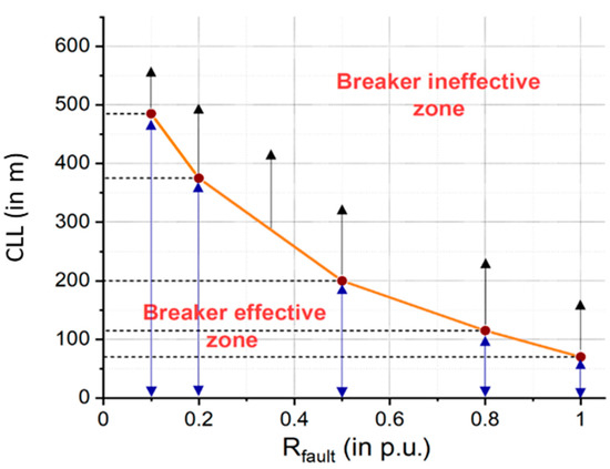 From the results, it was found that as the fault resistance increased, the Cable Length Limit for effective protection by the ZCB decreased gradually. Additionally, the breaker could provide protection for a longer distance in the case of a high-level fault current (i.e., a low fault resistance), whereas the protective distance was reduced significantly for a low-level fault current (i.e., a high fault resistance). Therefore, the cable length must be limited if the power system designer and operator plan to protect the entire line for their expected fault levels. In addition, similar tables and figures (such as Table 3 and Figure 3) can be introduced to determine a Cable Length Limit for a specified minimum fault current to protect DC cables. According to the relationship of CLL with Rfault in Figure 3, the CLL is proportional to the fault current level. Therefore, if the specified minimum fault current can be protected against within a certain cable, any higher fault current in that cable can be protected against as well due to the relatively higher CLLs.