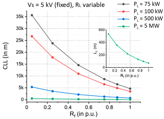 Beyond one case study in Section 3, the CLL was assessed here by changing the power delivery level in the pre-fault condition. The locations of faults in the DC lines for a successful tripping of the ICC-BZCB were recorded with four cases of load power pre-fault. In the simulation system, the voltage of the DC supply was fixed at Vs = 5.0 kV, with load powers of PL = 75 kW, 100 kW, 500 kW, and 5.0 MW, respectively. A fault branch consisting of a switch and fault resistance (Rf) was used to emulate the fault in the system, as shown in Figure 1. Based on the method of parameter specification in Section 2.1, the ZCB parameters were identified for the four cases as shown in Table 4. The values of the fault bases for this study are also listed in Table 4. The actual value of fault resistance (Rf_Actual) was calculated using (1), and is expressed per unit as Rf in Figure 4. For each load-power pre-fault condition, the ZCB’s behaviors were recorded and analyzed at different fault levels.