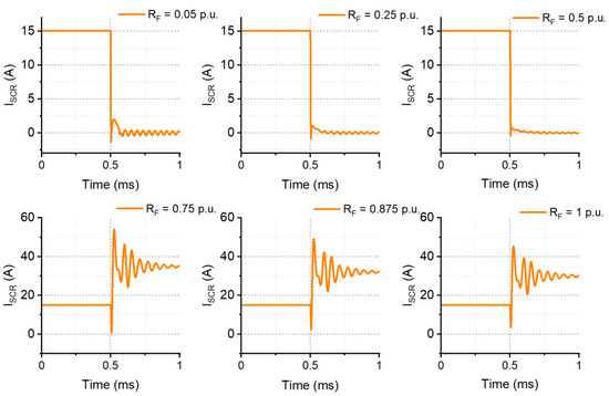 Figure 2 shows the three cases in the operation of ZCB with a load current (IL = 1.0 kA) pre-fault: Case I has a fault resistance (Rf = 0.1 p.u.) that causes a short-circuit fault current of 11 p.u. (equaling 10.0 p.u. from Rf and 1.0 p.u. from RL) in total; likewise, Case II considers a fault resistance (Rf = 0.5 p.u.) creating a fault current of 3.0 p.u.; finally, Case III shows a fault condition with Rf = 1.0 p.u. that causes a fault current of 2.0 p.u.