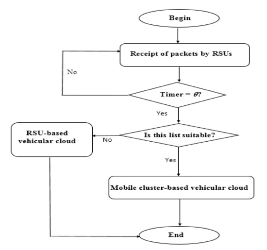 Consequently, the reception of the registration and request packets by RSUs triggers some operations to create clusters and select cluster heads or construct directories at RSUs level. Figure 3 depicts this process. When such an RSU receives the first packet, either a registration packet or request packet, it starts a timer. Then, the transmission process of packets continues until the timer reaches a certain threshold θ (e.g., 1.5 min), some operations are launched.