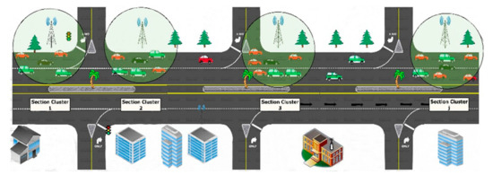 The RSUs proceed with creating vehicle clusters using vehicles’ coordinates in a plan of Euclidean space by defining what is called a section cluster. RCVC considers all routes on the map as sections from 1 to j, as shown in Figure 4.