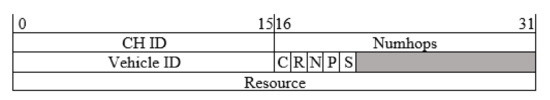The user in CV specifies its needed resources and attributes by sending a service packet (SP) to the SV using Numhops hops (explained in the experimental section). SP contains the ID of the vehicle and its requests. Upon receipt of the user service packet, the SV responds with a service response packet (SR) packet, asking the CV for the payment method. The CV and the SV exchange data packets corresponding to the resources. Figure 5 shows the structure of the RCVC protocol packet, where C, R, N, P, S are flags for the CP, RP, NACK, SP and SR packets, respectively.