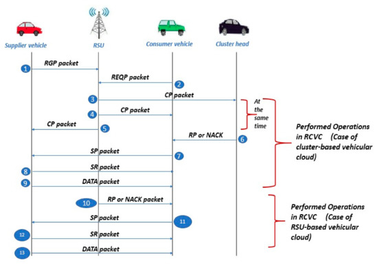 In the case of a cluster-based vehicular cloud, the CH has the role of managing the operation of consumption by sending the RP or NACK packets. In the second case of RSU-based vehicular cloud, the RSUs also continue to achieve the consumption operation by the RP or NACK packets. The rest of the operations is accomplished between vehicles using the SP, SR and data packets.