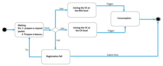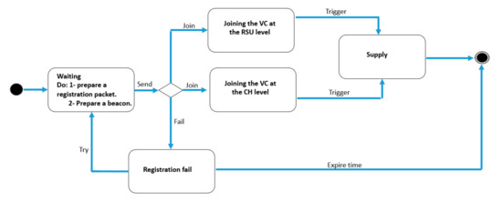 The supply and consume operation begins by registering all packets at the RSUs level, whether it is an RGP registration packet or a REQP request packet, as shown in Figure 6. The RSUs create the clusters by informing the vehicles belonging to the cluster by this creation through sending CP packets, or else by creating VCs at their levels.