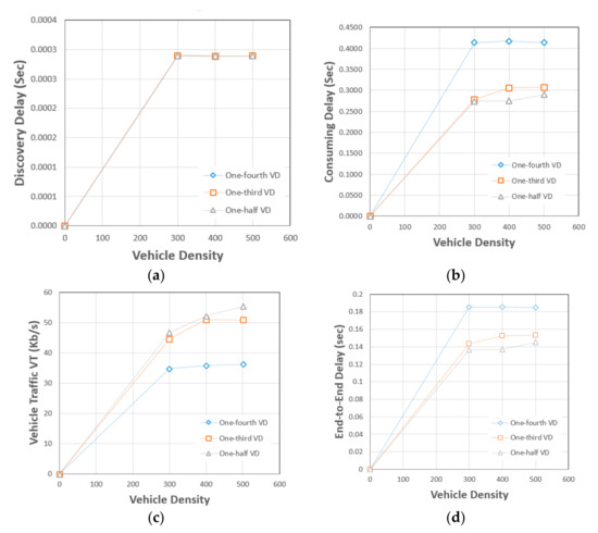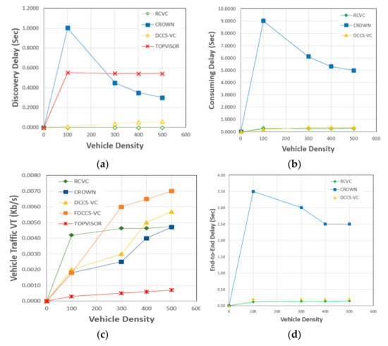 Performance evaluation of RCVC while varying the SV density: (a) Discovery Delay. (b) Consuming Delay. (c) Vehicle Traffic. (d) End-to-End Delay.