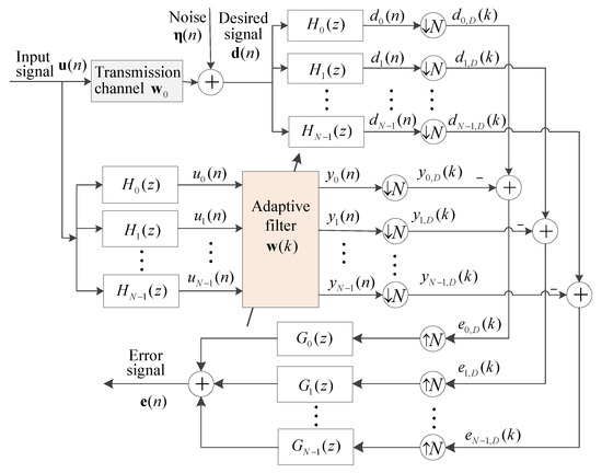 Subsequently, , , and are divided into N sub-band signals by the filters , respectively. , , and are the corresponding sub-band signals, . The sub-band signals and are critically decimated to generate the signals and , respectively. is the output of the ith sub-band filter. In each of the above equations, n indicates the sequence number of the original signal, and k indicates the sequence number of the decimated sequences. Therefore, the input signal, the desired output signal, and the output error can be represented as: