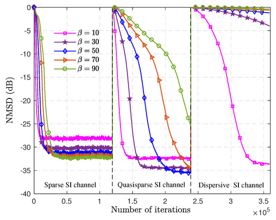 We define . NMSD reflects the closeness between the estimated weight vector and the real weight vector , and it can also be regarded as the steady-state error of the algorithm. Figure 2 shows the performance comparison in three different SI channels with different .