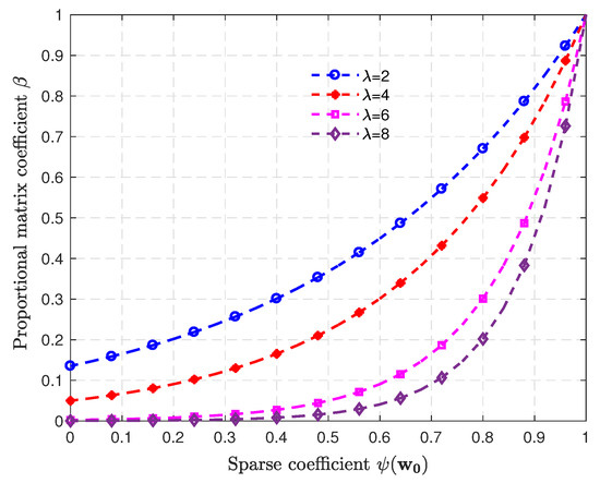 Figure 2 shows the influence of on the convergence speed and steady-state error of the algorithm. Comparing the performance of the algorithm with different in the same SI channel, we can know that the steady-state error decreases with an increase of , and the convergence speed decreases. The sparsity of the SI channel also affects the convergence speed and steady-state error of the algorithm. Comparing the performance of the algorithm with the same in different SI channels, the convergence speed decreases with the increase of the sparsity, while the steady-state error decreases. Therefore, we make a compromise on the convergence speed and steady-state error of the algorithm and improve the robustness of the algorithm to the SI channel with different sparsity. It is necessary to take a relatively large value of when the sparsity of the SI channel is large, so that the algorithm can obtain a smaller steady-state error. Similarly, should take a relatively small value to obtain a faster convergence speed when the sparsity of the SI channel is small. According to the relevant research on the influence of the sparsity of the SI channel on the performance of IPNLMS algorithm in [29,30], we construct the adaptive control parameter with the sparsity measurement values to approximate the curve of the relationship, which is expressed as: